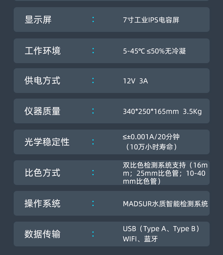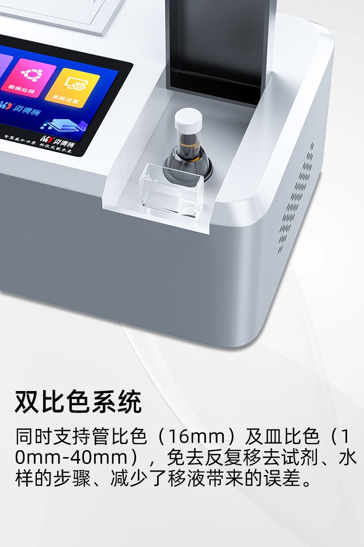 人工智能語音播報提示,可隨意調節(jié)音量, 使用更方便更 配備112種預先編程的曲線,曲線數量990條,可濃度直讀,測量結果更精密; 具有數據存儲功能,可存儲90萬組數據,并能自由查看; 10寸彩色液晶顯示觸摸屏,全中文操作模式,更便于操作掌握; 儀器自備校準功能,可根據標準樣品計算, 并存儲曲線,無需手動制作曲線; 配備USB接口傳輸功能,自帶打印機,可打印當前數據及存儲的歷史數據; 采用管比色、皿比色,雙比色系統